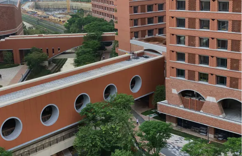 深圳中學(xué)(泥崗校區(qū))按照“一心兩軸三區(qū)”的規(guī)劃,將校園分為教學(xué)區(qū)、運動區(qū)及生活區(qū)。教學(xué)區(qū)共有4棟教學(xué)樓,采用U字形圍合布局,內(nèi)、外廊相結(jié)合,單體建筑之間相互連通,打造了一個無障礙的活動空間。